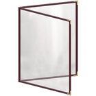 This menu cover boasts a green double stitched leatherette edge for long-lasting use. Its gold smooth metal corners also add a dignified and polished touch. Additionally, it is easy to wipe down at the end of the day, allowing you to give every guest the best possible dining experience. The clear, glossy design of the view panes helps promote excellent visibility, ensuring that customers will be able to easily read your options. Use this menu cover to present your offerings in a refined and organized way!