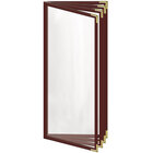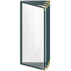This menu cover boasts a blue double stitched leatherette edge for long-lasting use. Its gold smooth metal corners also add a dignified and polished touch. Additionally, it is easy to wipe down at the end of the day, allowing you to give every guest the best possible dining experience. The clear, glossy design of the view panes helps promote excellent visibility, ensuring that customers will be able to easily read your options. Use this menu cover to present your offerings in a refined and organized way!