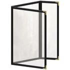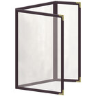 This menu cover boasts a red double stitched leatherette edge for long-lasting use. Its gold decorative metal corners also add a dignified and polished touch. Additionally, it is easy to wipe down at the end of the day, allowing you to give every guest the best possible dining experience. The clear, glossy design of the view panes helps promote excellent visibility, ensuring that customers will be able to easily read your options. Use this menu cover to present your offerings in a refined and organized way!