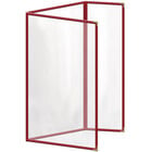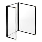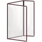 This menu cover boasts a maroon double stitched leatherette edge for long-lasting use. Its gold decorative metal corners also add a dignified and polished touch. Additionally, it is easy to wipe down at the end of the day, allowing you to give every guest the best possible dining experience. The clear, glossy design of the view panes helps promote excellent visibility, ensuring that customers will be able to easily read your options. Use this menu cover to present your offerings in a refined and organized way!