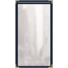 This menu cover boasts a green double stitched leatherette edge for long-lasting use. Its standard decorative gold metal corners also add a dignified and polished touch. Additionally, it is easy to wipe down at the end of the day, allowing you to give every guest the best possible dining experience. The clear, glossy design of the view panes helps promote excellent visibility, ensuring that customers will be able to easily read your options. Use this menu cover to present your offerings in a refined and organized way!