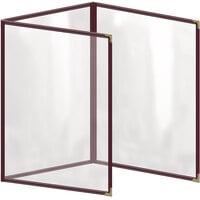 This menu cover boasts a maroon double stitched leatherette edge for long-lasting use. Its standard decorative gold metal corners also add a dignified and polished touch. Additionally, it is easy to wipe down at the end of the day, allowing you to give every guest the best possible dining experience. The clear, glossy design of the view panes helps promote excellent visibility, ensuring that customers will be able to easily read your options. Use this menu cover to present your offerings in a refined and organized way!