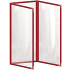 Present your menu offerings in style with this H. Risch, Inc. TES Deluxe Sewn 4 1/4" x 11" green 6 view foldout vinyl menu cover with gold smooth corners and gloss finish. With a colorful leatherette trim, this menu cover promotes a professional appearance in any setting. Its three pockets accommodate six 4 1/4" x 11" inserts, making it perfect for presenting your signature dishes, happy hour specials, wine lists, or dessert menus. Plus, if your menu changes frequently, the inserts can be removed and replaced within seconds.