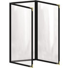This menu cover boasts a green double stitched edge for long-lasting use. Its smooth gold metal corners also add a dignified and polished touch. Additionally, it is easy to wipe down at the end of the day, allowing you to give every guest the best possible dining experience. The clear, glossy design of the view panes helps promote excellent visibility, ensuring that customers will be able to easily read your options. Use this menu cover to present your offerings in a refined and organized way!