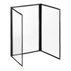 This menu cover boasts a green double stitched edge for long-lasting use. Its standard decorative gold metal corners also add a dignified and polished touch. Additionally, it is easy to wipe down at the end of the day, allowing you to give every guest the best possible dining experience. The clear, glossy design of the view panes helps promote excellent visibility, ensuring that customers will be able to easily read your options. Use this menu cover to present your offerings in a refined and organized way!