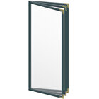 This menu cover boasts a green double stitched leatherette edge for long-lasting use. Its gold decorative metal corners also add a dignified and polished touch. Additionally, it is easy to wipe down at the end of the day, allowing you to give every guest the best possible dining experience. The clear, matte design of the view panes hides scratches and helps promote excellent visibility, ensuring that customers will be able to easily read your options. Use this menu cover to present your offerings in a refined and organized way!