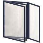 This menu cover boasts a blue double stitched leatherette edge for long-lasting use. Its black smooth metal corners also add a dignified and polished touch. Additionally, it is easy to wipe down at the end of the day, allowing you to give every guest the best possible dining experience. The clear, glossy design of the view panes helps promote excellent visibility, ensuring that customers will be able to easily read your options. Use this menu cover to present your offerings in a refined and organized way!