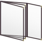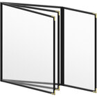 This menu cover boasts a black double stitched leatherette edge for long-lasting use. Its gold smooth metal corners also add a dignified and polished touch. Additionally, it is easy to wipe down at the end of the day, allowing you to give every guest the best possible dining experience. The clear, matte design of the view panes hides scratches and helps promote excellent visibility, ensuring that customers will be able to easily read your options. Use this menu cover to present your offerings in a refined and organized way!