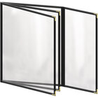 This menu cover boasts a brown double stitched leatherette edge for long-lasting use. Its gold smooth metal corners also add a dignified and polished touch. Additionally, it is easy to wipe down at the end of the day, allowing you to give every guest the best possible dining experience. The clear, glossy design of the view panes helps promote excellent visibility, ensuring that customers will be able to easily read your options. Use this menu cover to present your offerings in a refined and organized way!