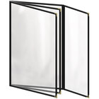 This menu cover boasts a maroon double stitched leatherette edge for long-lasting use. Its gold decorative metal corners also add a dignified and polished touch. Additionally, it is easy to wipe down at the end of the day, allowing you to give every guest the best possible dining experience. The clear, glossy design of the view panes helps promote excellent visibility, ensuring that customers will be able to easily read your options. Use this menu cover to present your offerings in a refined and organized way!
