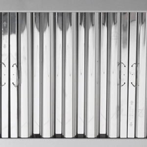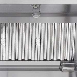 The hood uses (12) 20" x 20" baffle-type filters, and the filters are made from stainless steel to provide durability and make cleaning easy. 18-gauge 430 stainless steel is used on all exposed surfaces to give it excellent durability and cleanability, while the MIG-welded frame provides seamless, liquid-tight joints. The hood features a box-style canopy design to provide superior performance. This model is also engineered with a 3" air gap on the back of the hood, which provides clearance and protection for combustible walls where code requires.
