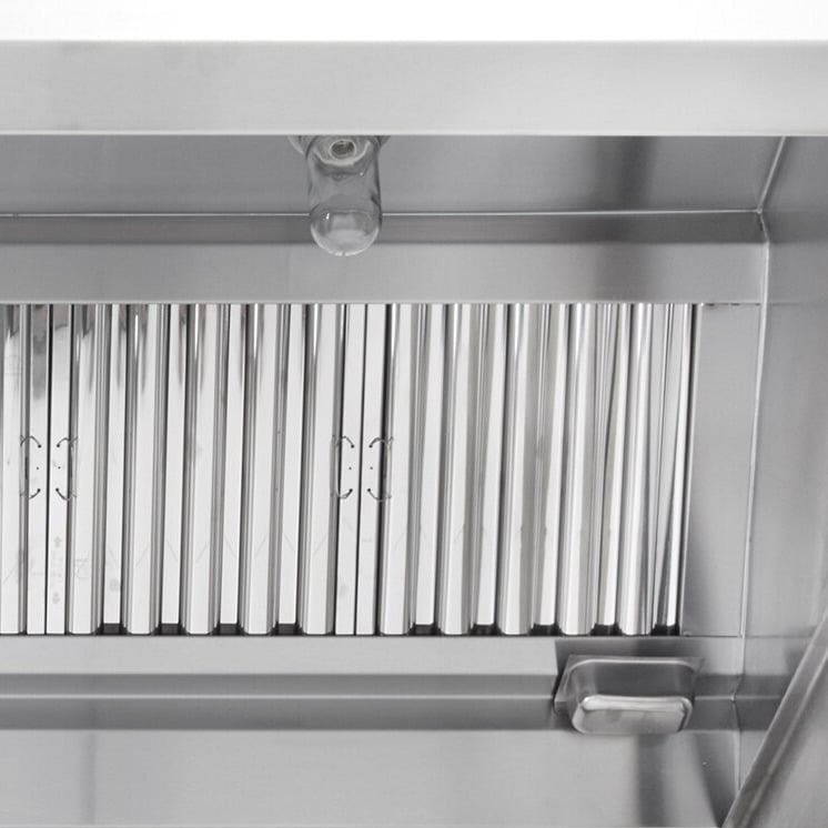 The hood uses (3) 20" x 16" baffle-type filters, and grease is collected in a trough that drains into a stainless steel cup for disposal. 18-gauge 430 stainless steel is used on all surfaces to provide excellent durability while the MIG-welded frame provides seamless, liquid-tight joints. The hood features a box-style canopy design to provide superior performance, and a 3" gap on the back of the hood provides clearance and protection for combustible walls where code requires.