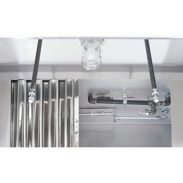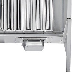 The hood uses (2) 20" x 20" and (2) 20" x 16" baffle-type filters, and grease is collected in a trough that drains into a stainless steel cup for disposal. 18-gauge 430 stainless steel is used on all surfaces to provide excellent durability while the MIG-welded frame provides seamless, liquid-tight joints. The hood features a sloped-front canopy design that is great for low ceilings, providing extra front clearance and comfort for chefs, and dropping down close to the equipment in the back.