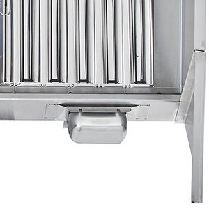 The hood uses (3) 20" x 20" and (3) 20" x 16" baffle-type filters, and grease is collected in a trough that drains into a stainless steel cup for disposal. 18-gauge 430 stainless steel is used on all surfaces to provide excellent durability while the MIG-welded frame provides seamless, liquid-tight joints. The hood features a sloped-front canopy design that is great for low ceilings, providing extra front clearance and comfort for chefs, and dropping down close to the equipment in the back.