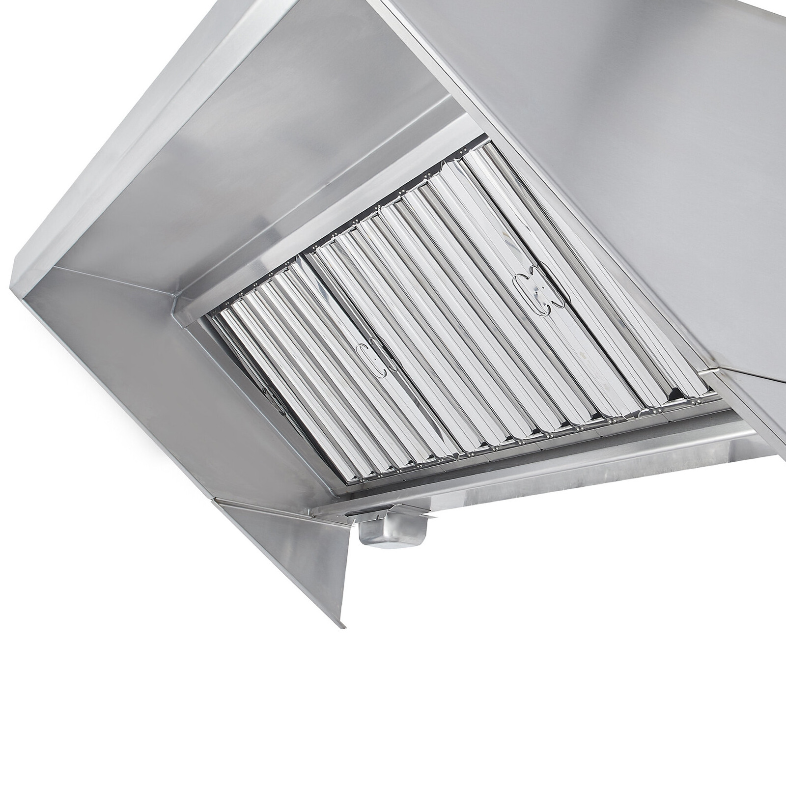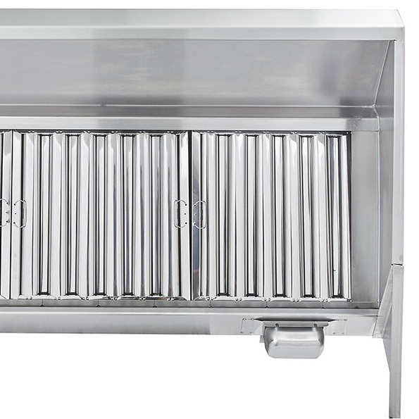 The hood uses (2) 20" x 20" and (2) 20" x 16" baffle-type filters, and grease is collected in a trough that drains into a stainless steel cup for disposal. 18-gauge 430 stainless steel is used on all surfaces to provide excellent durability while the MIG-welded frame provides seamless, liquid-tight joints. The hood features a sloped-front canopy design that is great for low ceilings, providing extra front clearance and comfort for chefs, and dropping down close to the equipment in the back.