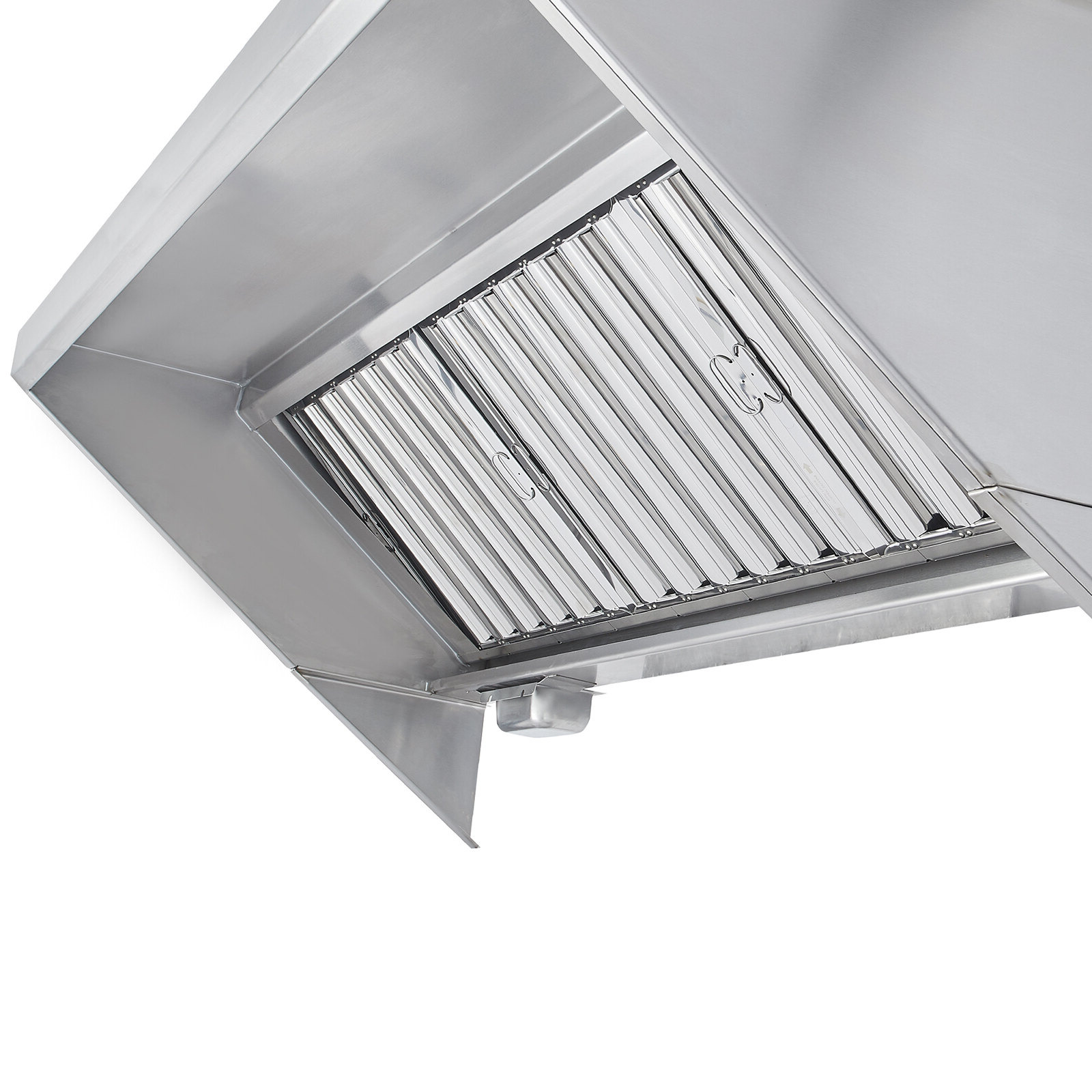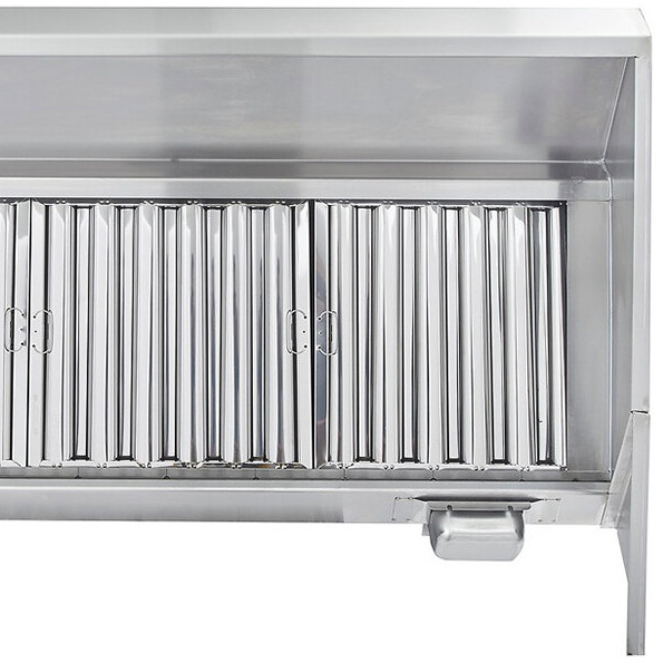 The hood uses (3) 20" x 20" and (3) 20" x 16" baffle-type filters, and grease is collected in a trough that drains into a stainless steel cup for disposal. 18-gauge 430 stainless steel is used on all surfaces to provide excellent durability while the MIG-welded frame provides seamless, liquid-tight joints. The hood features a sloped-front canopy design that is great for low ceilings, providing extra front clearance and comfort for chefs, and dropping down close to the equipment in the back.