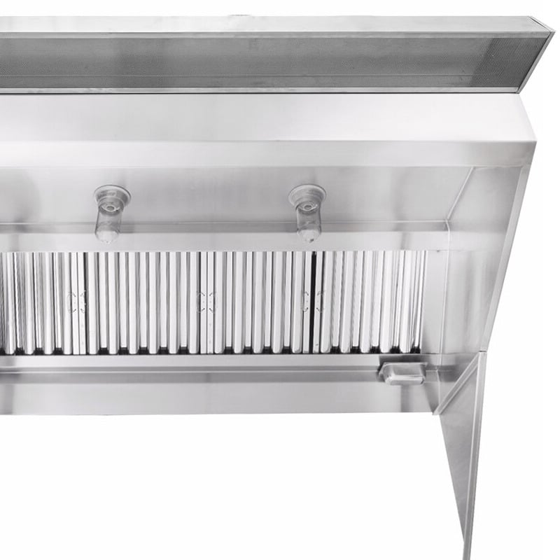 The hood features a sloped-front canopy design that is great for low ceilings, providing extra front clearance and comfort for chefs, and dropping down close to the equipment in the back. This unit is suitable for use over any equipment that has a surface operating temperature under 700 degrees Fahrenheit, and that is required by fire code to have a type 1 hood - this includes fryers, griddles, charbroilers, conveyor pizza ovens, or any equipment that produces grease during the cooking process. The hood removes the grease-laden vapors produced by your equipment and prevents them from accumulating in places where they could become a fire or sanitation hazard, leaving your kitchen clean and safe to use!