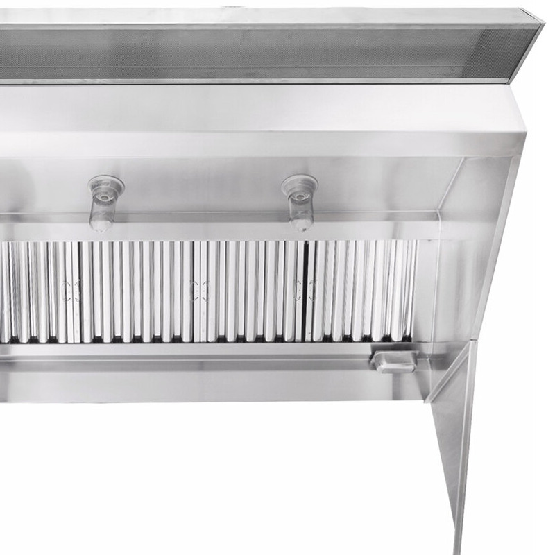 The hood features a sloped-front canopy design that is great for low ceilings, providing extra front clearance and comfort for chefs, and dropping down close to the equipment in the back. This unit is suitable for use over any equipment that has a surface operating temperature under 700 degrees Fahrenheit, and that is required by fire code to have a type 1 hood - this includes fryers, griddles, charbroilers, conveyor pizza ovens, or any equipment that produces grease during the cooking process. The hood removes the grease-laden vapors produced by your equipment and prevents them from accumulating in places where they could become a fire or sanitation hazard, leaving your kitchen clean and safe to use!