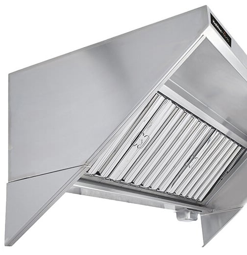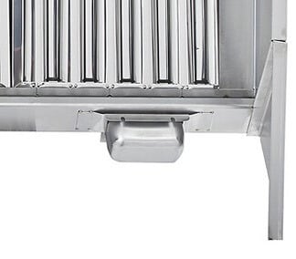 The hood uses (6) 20" x 20" baffle-type filters, and grease is collected in a trough that drains into a stainless steel cup for disposal. 18-gauge 430 stainless steel is used on all surfaces to provide excellent durability while the MIG-welded frame provides seamless, liquid-tight joints. The hood features a box-style canopy design to provide superior performance, and a 3" gap on the back of the hood provides clearance and protection for combustible walls where code requires.