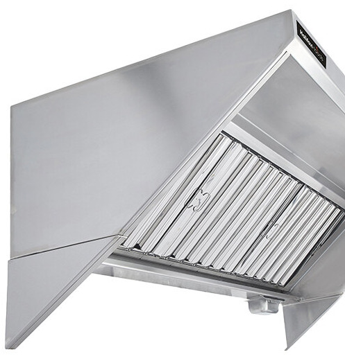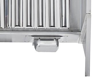 The hood uses (3) 20" x 20" baffle-type filters, and grease is collected in a trough that drains into a stainless steel cup for disposal. 18-gauge 430 stainless steel is used on all surfaces to provide excellent durability while the MIG-welded frame provides seamless, liquid-tight joints. The hood features a box-style canopy design to provide superior performance, and a 3" gap on the back of the hood provides clearance and protection for combustible walls where code requires.
