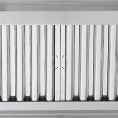 The hood uses (5) 20" x 20" and (2) 20" x 16" baffle-type filters, and grease is collected in a trough that drains into a stainless steel cup for disposal. 18-gauge 430 stainless steel is used on all surfaces to provide excellent durability while the MIG-welded frame provides seamless, liquid-tight joints. The hood features a box-style canopy design to provide superior performance, and a 3" gap on the back of the hood provides clearance and protection for combustible walls where code requires.