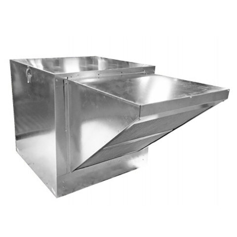 The hood uses (2) 20" x 20" and (2) 20" x 16" baffle-type filters, and grease is collected in a trough that drains into a stainless steel cup for disposal. 18-gauge 430 stainless steel is used on all surfaces to provide excellent durability while the MIG-welded frame provides seamless, liquid-tight joints. The hood features a box-style canopy design to provide superior performance, and a 3" gap on the back of the hood provides clearance and protection for combustible walls where code requires.