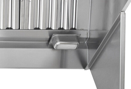 The hood uses (2) 20" x 20" and (2) 20" x 16" baffle-type filters, and grease is collected in a trough that drains into a stainless steel cup for disposal. 18-gauge 430 stainless steel is used on all surfaces to provide excellent durability while the MIG-welded frame provides seamless, liquid-tight joints. The hood features a box-style canopy design to provide superior performance, and a 3" gap on the back of the hood provides clearance and protection for combustible walls where code requires.