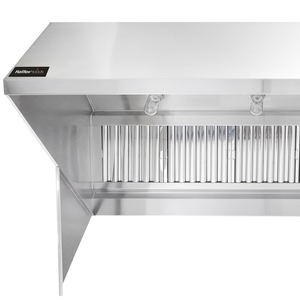 The hood uses (3) 20" x 20" and (3) 20" x 16" baffle-type filters, and grease is collected in a trough that drains into a stainless steel cup for disposal. 18-gauge 430 stainless steel is used on all surfaces to provide excellent durability while the MIG-welded frame provides seamless, liquid-tight joints. The hood features a box-style canopy design to provide superior performance, and a 3" gap on the back of the hood provides clearance and protection for combustible walls where code requires.