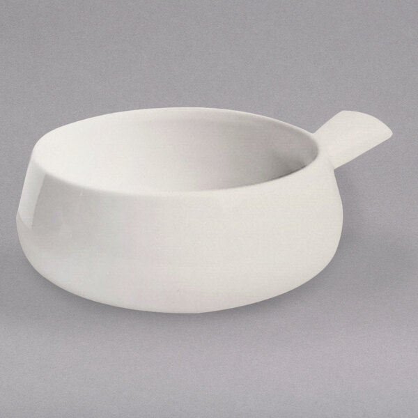 This Hall China from Steelite International HL6430AWHA ivory (american white) 16 oz. handled soup bowl is ideal for serving a wide variety of soups including bisques, chowders, and much more. Its easy grip handle is perfect for customers to tip the bowl for those last few drops! Hall China from Steelite International provides the best heat and cold retention available, and is specifically designed to distribute heat uniformly to prevent scorching and burning during service.