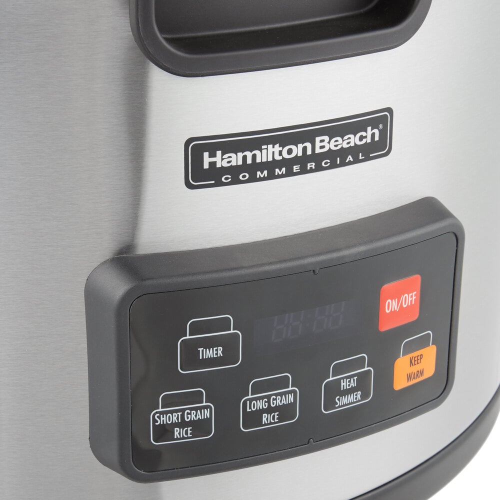 Cook up hearty portions of rice with this versatile Hamilton Beach 37590 electric rice cooker! Boasting 2500W of power, this reliable unit can prepare up to 90 cups of cooked rice, making it ideal for any busy commercial kitchen. Not only for rice, use this cooker for grits, oatmeal, or macaroni and cheese! Choose from cook options for "short grain rice" or "long grain rice" when preparing a meal or take advantage of the "heat / simmer" and "keep warm" features to maintain the temperature of pre-cooked soups and stews.