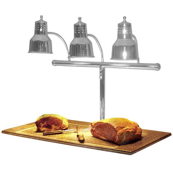 Keep your most popular meats, breads, and more hot as you cut and serve them with the Hanson Heat Lamps 3LM-BB-SS triple bulb 20" x 36" stainless steel carving station! This carving station features three bulb warmers on tall stands to provide adequate clearance for you to cut up a delicious meal in front of your customers. It also provides ample lighting to showcase product, making it great for butcher shops, cafes, buffets, catered events, and other display venues.