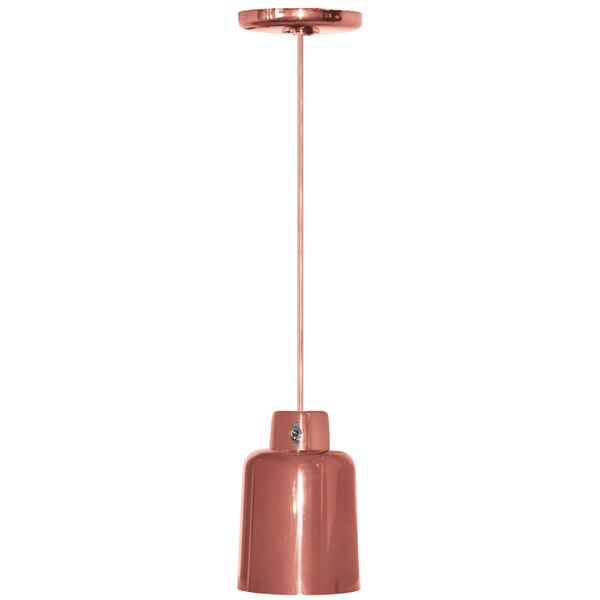 Create an inviting atmosphere and let customers know you have delicious, warm food ready with the Hanson Heat Lamps 700-SMT-COP rigid ceiling mount heat lamp! This lamp's body is made of heavy gauge aluminum, and it features a 7" diameter rounded shade attached to a 3/8" thick rigid stem. Its attractive bright copper finish provides your establishment with a sleek, modern touch, and a clear enamel topcoat prevents tarnishing and reduces the need to polish the lamp's surface.