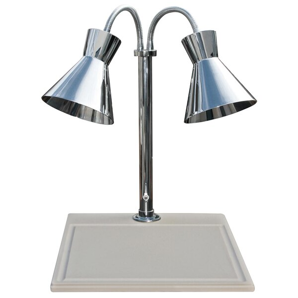 This unit features two chrome warming lamps with 7 1/8" x 7 1/2" shades that boast 500W of heating power in total. A tall stand provides adequate clearance for you to slice up a delicious meal for your customers, while the adjustable gooseneck and 18" x 20" cutting board offer plenty of room to comfortably cut your products. To make clean up easy, the white synthetic granite cutting board comes with a gravy lane to collect drips and juices. This carving station requires a 115V electrical connection. Light bulbs included.