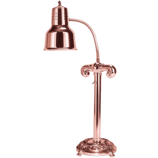 Warm and display your freshly cooked dishes with style and ease with this Hanson Heat Lamps SLM/RB9/ANT/BCOP single bulb flexible freestanding heat lamp! Great for use at your buffet or catered event, this heat lamp ensures your prepared foods will taste warm and fresh for all of your guests. Because it features a portable design with a flexible gooseneck to aim the light, this heat lamp can be placed over any product including meat at a carving station, cooked vegetables in steam pans, or even baskets of freshly baked bread! Its 6 1/2" conical shaped shade combines with an attractive bright copper finish to provide a classic, professional appearance, while its 9" antique style base provides a sturdy, stable foundation.