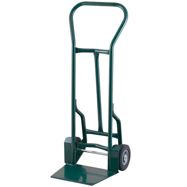 Moving the heaviest loads is easier than ever thanks to this Harper 32T57 Taper Noz hand truck! With its extra-large 17" x 14" x 13" tapered base plate, this hand truck can easily slide under almost anything, and its 51" tall welded steel frame and 3/4" axle provide support for even tall loads and stacks up to 900 lb. Heavy gauge steel fenders protect products from rubbing against the wheels and also tie the base plate to the frame for added strength, while 8" x 2 1/4" solid rubber wheels and a continuous handle provide a smooth ride every time.