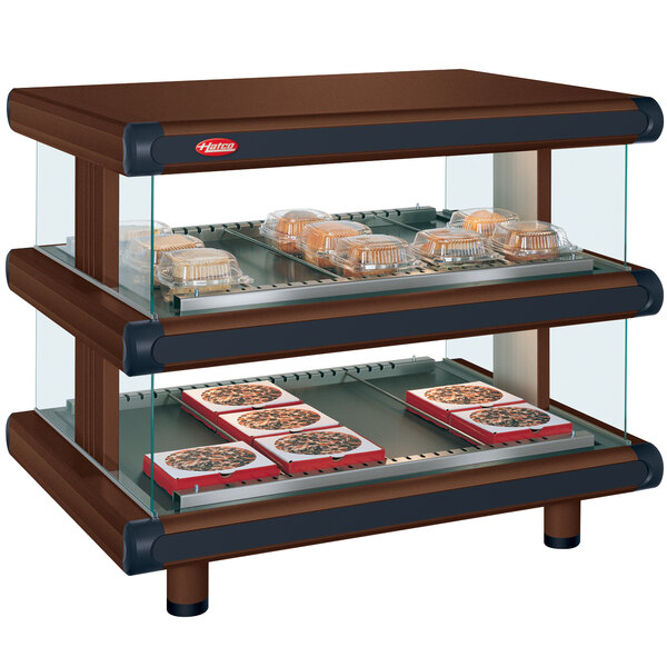 Showcase delicious wrapped food like breakfast sandwiches, hamburgers, pizza, nachos, and more with the Hatco GR2SDH-30D antique copper Glo-Ray Designer 30" horizontal double shelf merchandiser! The unit's sleek aluminum, stainless steel, and tempered glass construction makes a great focal point on any countertop, and it features attractive black color insets (additional colors available upon request). It's perfect for encouraging impulse and point of purchase sales, and customers are able to easily serve themselves thanks to the open front!