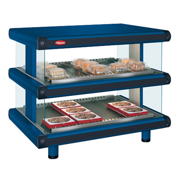 Showcase delicious wrapped food like breakfast sandwiches, hamburgers, pizza, nachos, and more with the Hatco GR2SDH-48D navy blue Glo-Ray Designer 48" horizontal double shelf merchandiser! The unit's sleek aluminum, stainless steel, and tempered glass construction makes a great focal point on any countertop, and it features attractive black color insets (additional colors available upon request). It's perfect for encouraging impulse and point of purchase sales, and customers are able to easily serve themselves thanks to the open front!