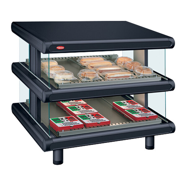 Showcase delicious wrapped food like breakfast sandwiches, hamburgers, pizza, nachos, and more with the Hatco GR2SDS-48D black Glo-Ray Designer 48" slanted double shelf merchandiser! The unit's sleek aluminum, stainless steel, and tempered glass construction makes a great focal point on any countertop, and it features attractive black color insets (additional colors available upon request). It's perfect for encouraging impulse and point of purchase sales, and customers are able to easily serve themselves thanks to the open front!