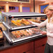 This double shelf warmer has prefocused infrared top heat that radiates down onto food, while the thermostatically-controlled, hardcoated heated base extends holding times without sacrificing quality. Extra heat is directed toward each shelf's outer edges where heat loss is the greatest, to ensure all food stays evenly warm. Plus, shatter-resistant incandescent lights attractively illuminate products!
