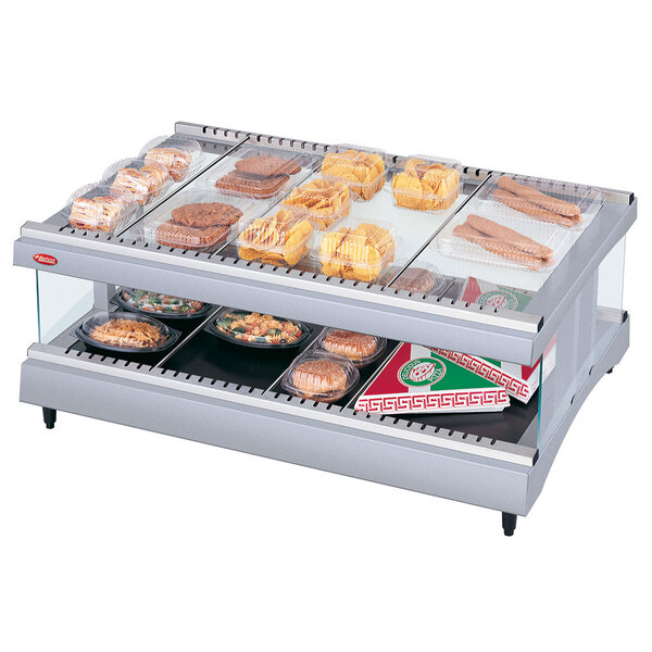 Show off your most popular impulse buys and keep delicious wrapped food warm with the Hatco GR3SDH-39 white granite Glo-Ray 39" horizontal single shelf heated glass merchandising warmer! Perfect for hamburgers, breakfast sandwiches, pizza, and other warm to-go items, this merchandiser easily showcases products while holding them at ideal temperatures.
