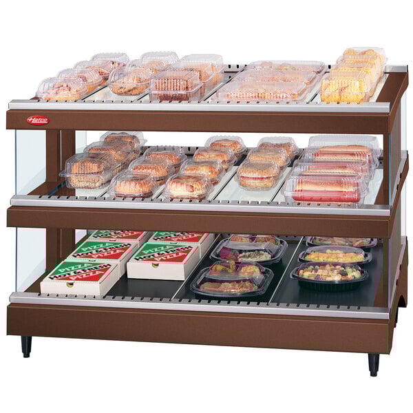Show off your most popular impulse buys and keep delicious wrapped food warm with the Hatco GR3SDS-39D antique copper Glo-Ray 39" slanted double shelf heated glass merchandising warmer! Perfect for hamburgers, breakfast sandwiches, pizza, and other warm to-go items, this merchandiser easily showcases products while holding them at ideal temperatures.