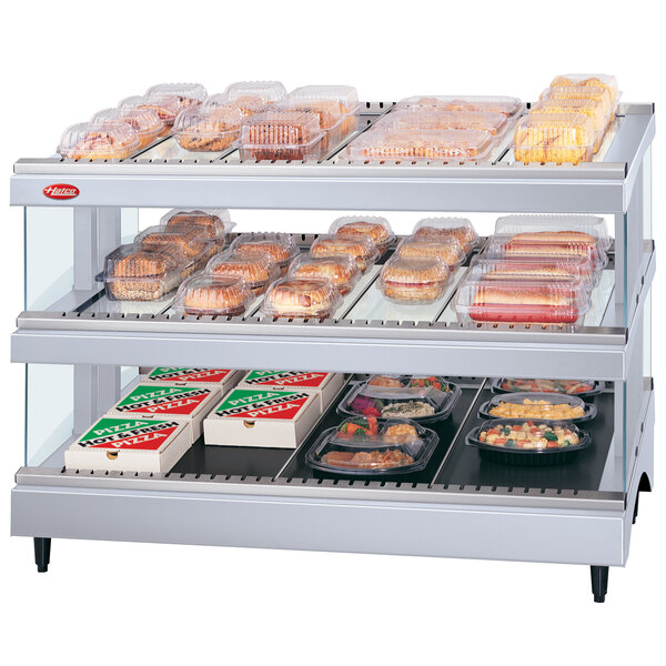 Show off your most popular impulse buys and keep delicious wrapped food warm with the Hatco GR3SDS-39D white granite Glo-Ray 39" slanted double shelf heated glass merchandising warmer! Perfect for hamburgers, breakfast sandwiches, pizza, and other warm to-go items, this merchandiser easily showcases products while holding them at ideal temperatures.