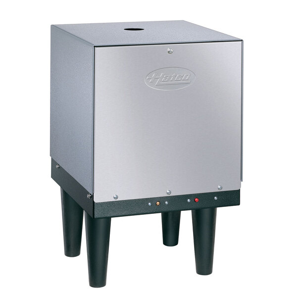The Hatco MC-11 Mini-Compact electric specialty booster water heater provides water at 180 degrees Fahrenheit for hot water sanitizing or point-of-use dispensing. The heater features a stainless steel tank with a storage capacity of 3.2 gallons and a fast recovery time. Made with a stainless steel front for aesthetic appeal, the other sides of the heater are powder-coated silver-gray, and the bottom and legs are black.