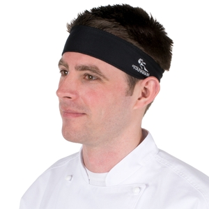 Provide maximum comfort and style for your restaurant's kitchen team with the classic styling of this black high-performance fabric headband. Busy chefs and cooks will love the absorbency, especially in a hot kitchen setting. Made with performance fabric, this one-size-fits-most headband also allows for easy custom logo application.