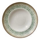 Create a colorful table setting with this Heart & Soul Soulmate 10 7/8" round jade porcelain deep coupe plate. The hand-painted, modern folk pattern adds a faint tactile feel to the plate indicative of the Soulmate collection and features a green-detailed wide rim. This plate is ideal for serving large dinner entrees while its coupe edge and deep design keep your food offerings contained.