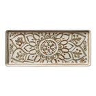 Create a colorful table setting with this Heart & Soul Soulmate 13 3/4" x 5 7/8" rectangular jade porcelain platter. The hand-painted, modern folk pattern adds a faint tactile feel to the platter indicative of the Soulmate collection and features green details with a brown rim. This platter is ideal for serving large meat and seafood entrees while its coupe edge keeps your food offerings contained.
