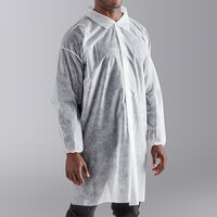Keep your employees' skin and clothes protected with this Cordova lab coat. Made of polypropylene, this lab coat offers ample protection from hazardous and non-hazardous dry particulates. The heavy weight fabric offers a cool, breathable fit while providing protection for heavy-duty, demanding applications. This lab coat is conveniently disposable after use.
