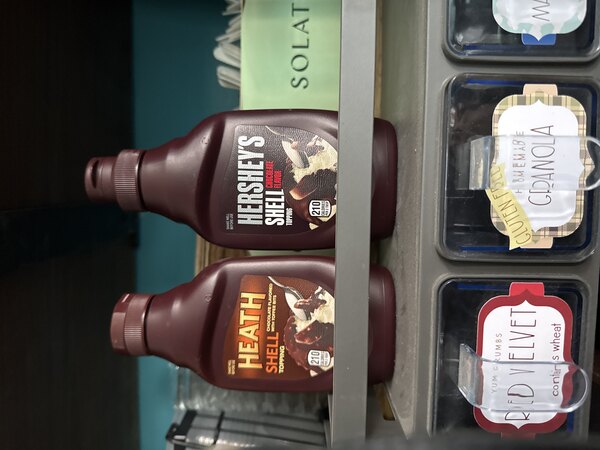 This chocolate shell topping is packaged in a user-friendly 7.25 fl. oz. plastic squeeze bottle for easy, mess-free dispensing and better control. Its size is perfect for keeping behind the counters for employees to dispense, or for placing at your cafeteria's ice cream station for guests to dispense themselves. For best results, turn the bottle upside down and shake well for approximately 30 seconds before dispensing, and do not refrigerate.