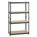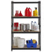 The frame is made of durable riveted steel with a black crinkle powder coat finish that provides rust resistance for a longer product life. Each shelf is made of rugged particleboard material, too. Since the shelves are solid, they are great for storing items that might tip over or fall through regular wire shelves or vented shelves.