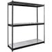 The frame is made of durable riveted steel with a gunmetal gray powder coat finish that provides rust resistance for a longer product life. Each shelf is made of rugged black laminated material, too. Since the shelves are solid, they are great for storing items that might tip over or fall through regular wire shelves or vented shelves.